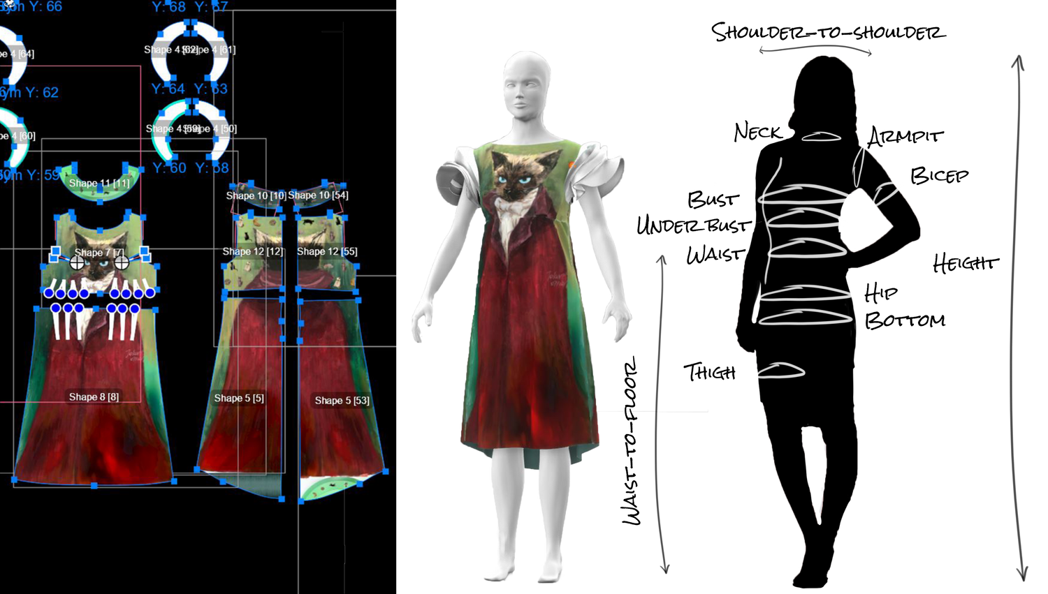 We simulate the digital outfit with your measurements in software and custom create the physical outfit for you.