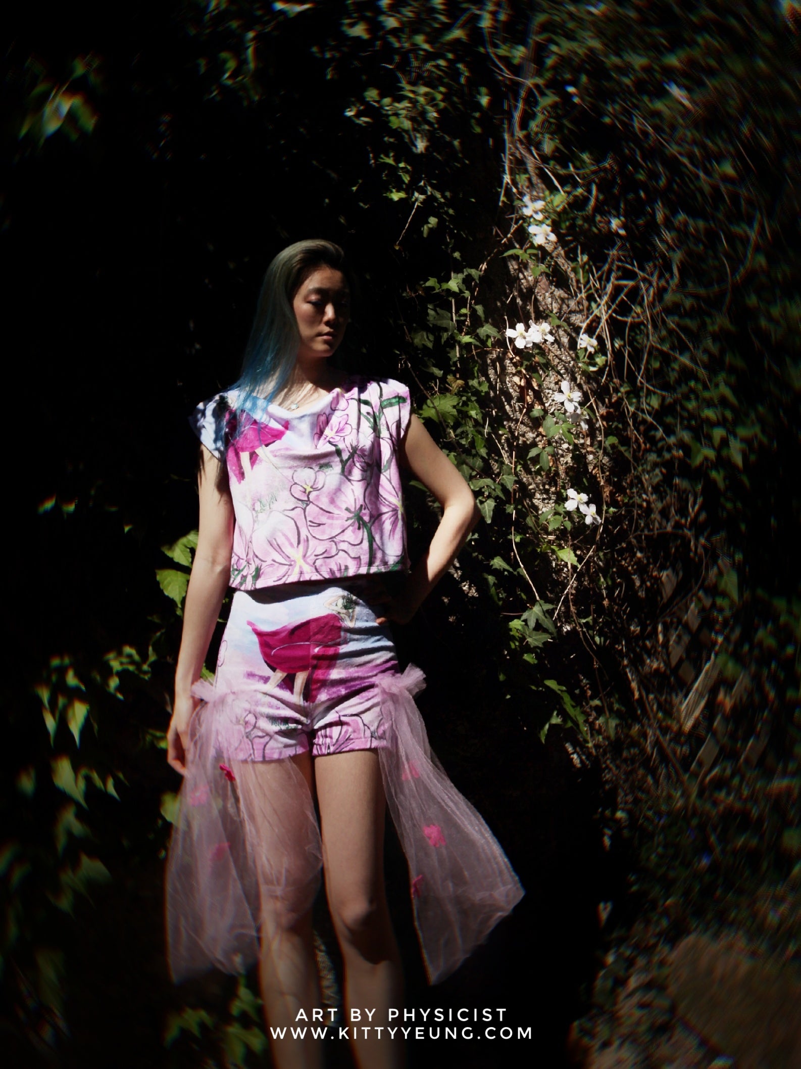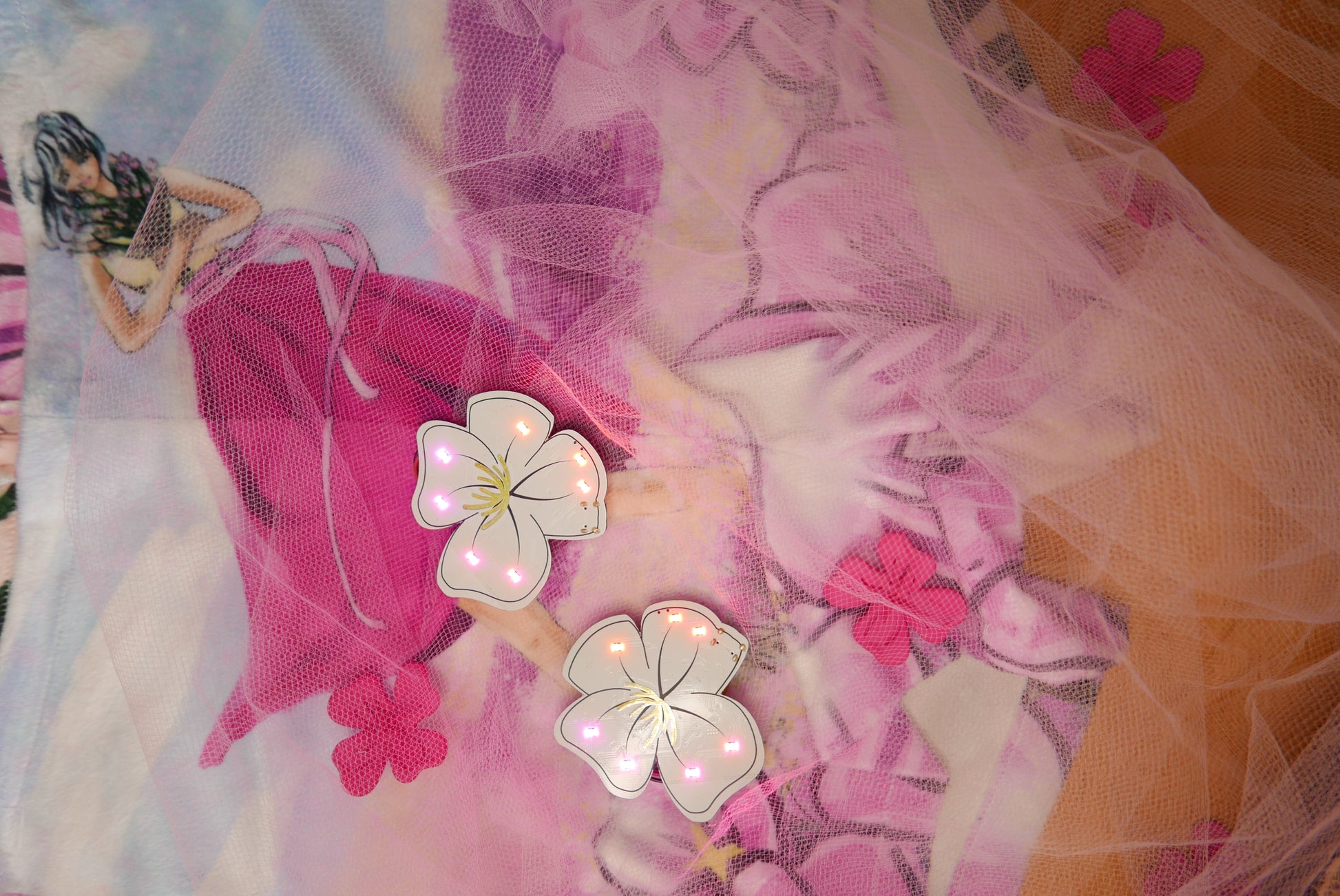 Companion brooches match the Flower outfit (top, shorts and mask cover) with hand digital painting on fabric and 3D printed flowers on tulle.