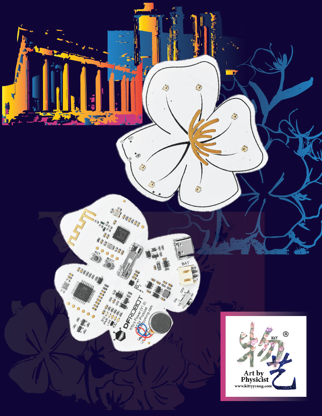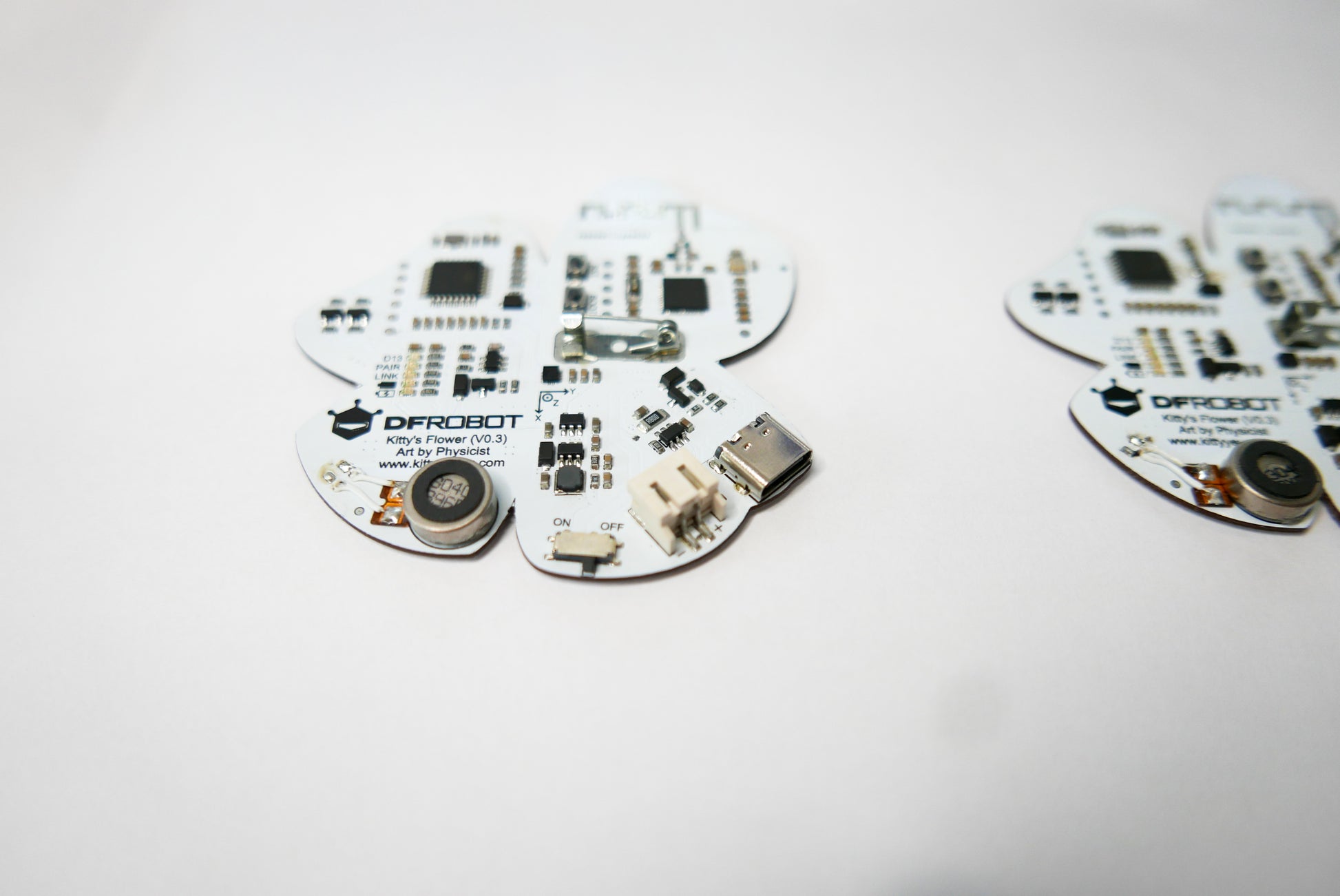 Kitty's Flower is a pair of Bluetooth wearable brooches. Jointly created by Art by Physicist and DFRobot, they are specially designed for wearable application scenarios, integrated power management system, RGB LED lights, accelerometer, sensors, vibration, and touch. Support Arduino and Scratch programming, and can be used as the core intelligent control unit for wearable products, interactive art installations, and new accessories. Two are matched as a pair, and various effects can be programmed by users. The factory-set functions are programmed for the above-mentioned scenario. Learn how to reprogram the boards on DFRobot's product wiki or Adafruit Learn.