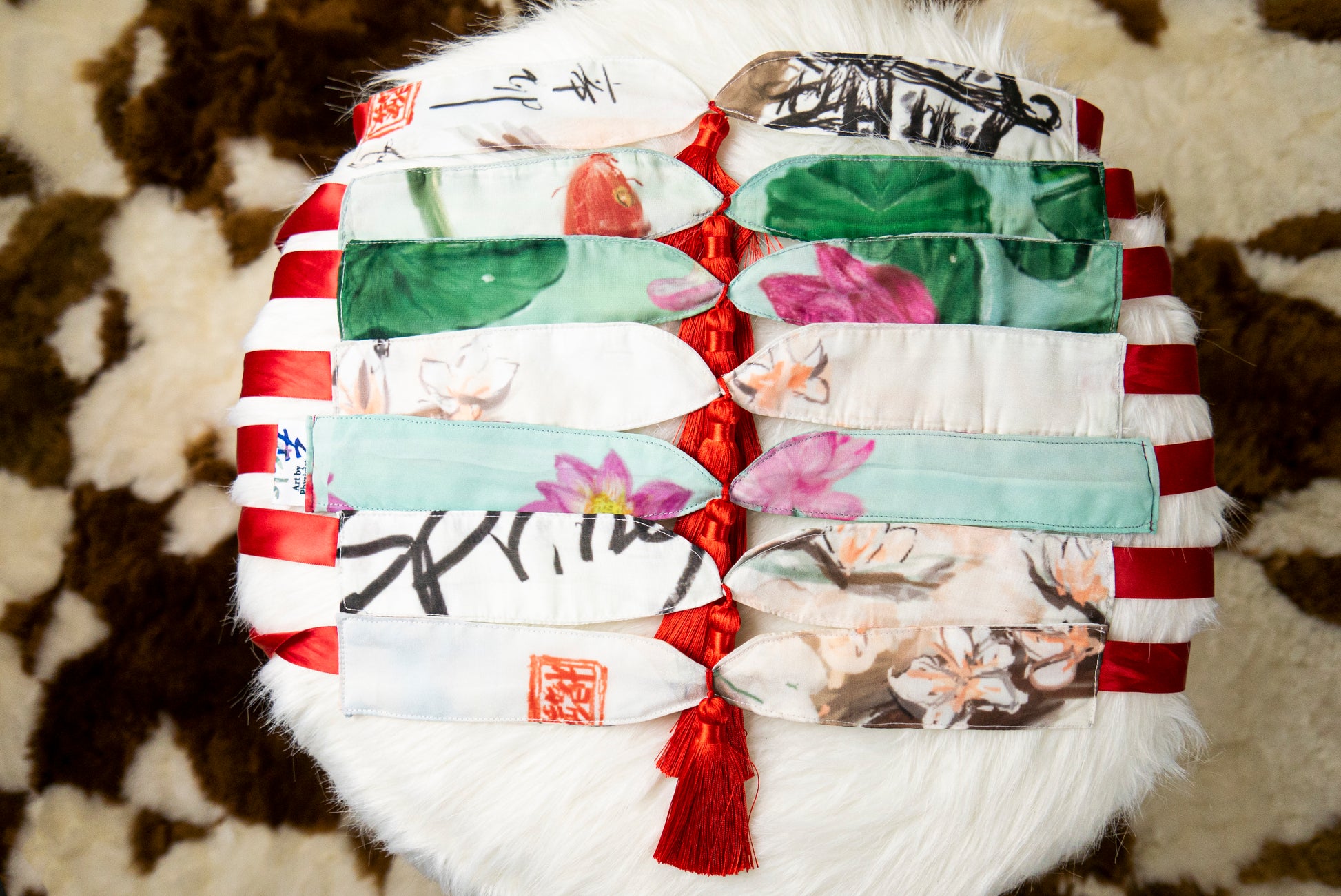 One type of material waste in garment making is due to the fact that fabrics come in a rectangular shape, while cloth patterns are not. No matter how you arrange and cut the patterns, there are still unused areas of the fabric. To reduce waste, Designer KtY hand crafted the extra fabrics into cute little collars. The graphics on the collars are random and are fragments of her paintings.