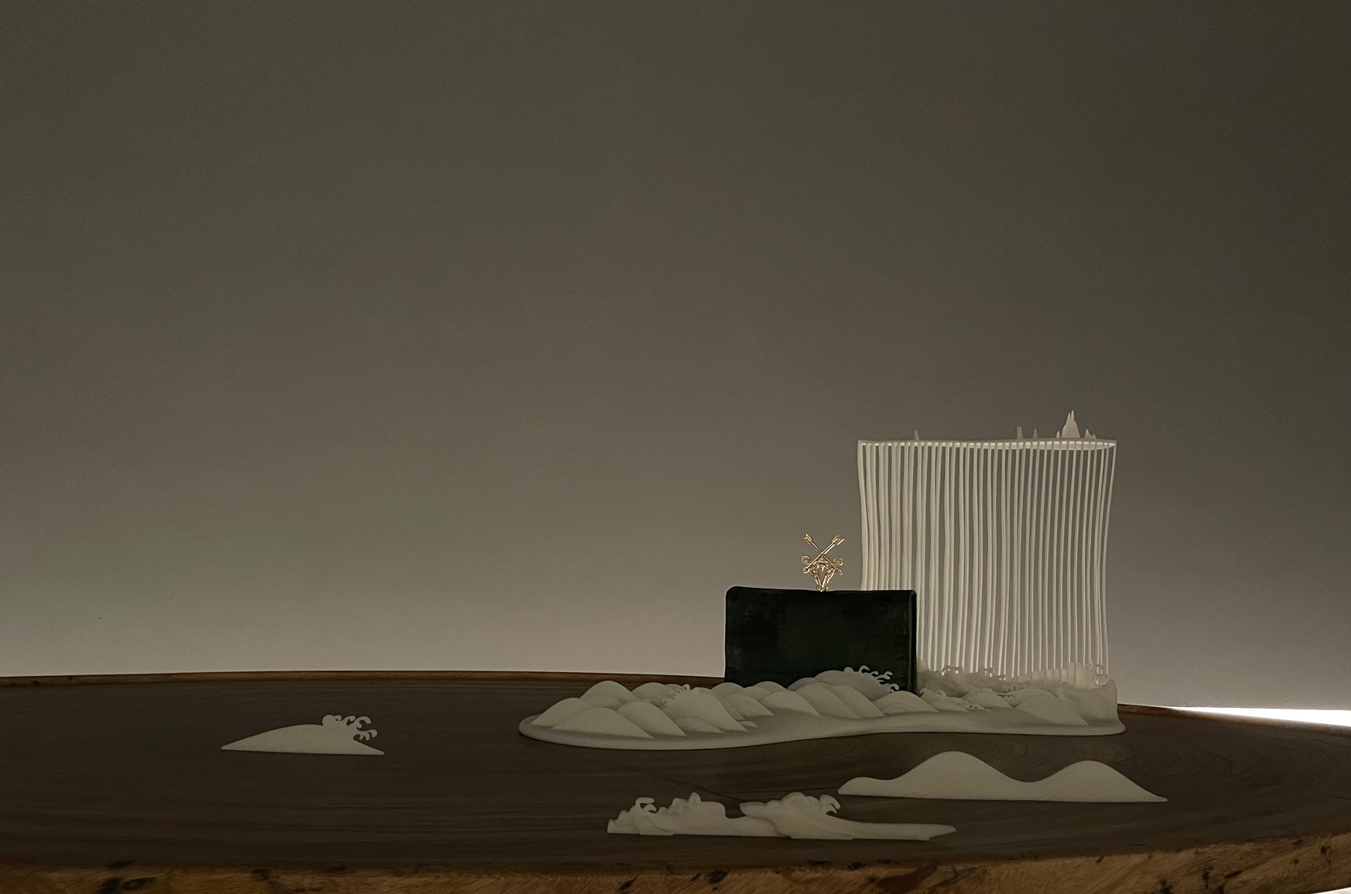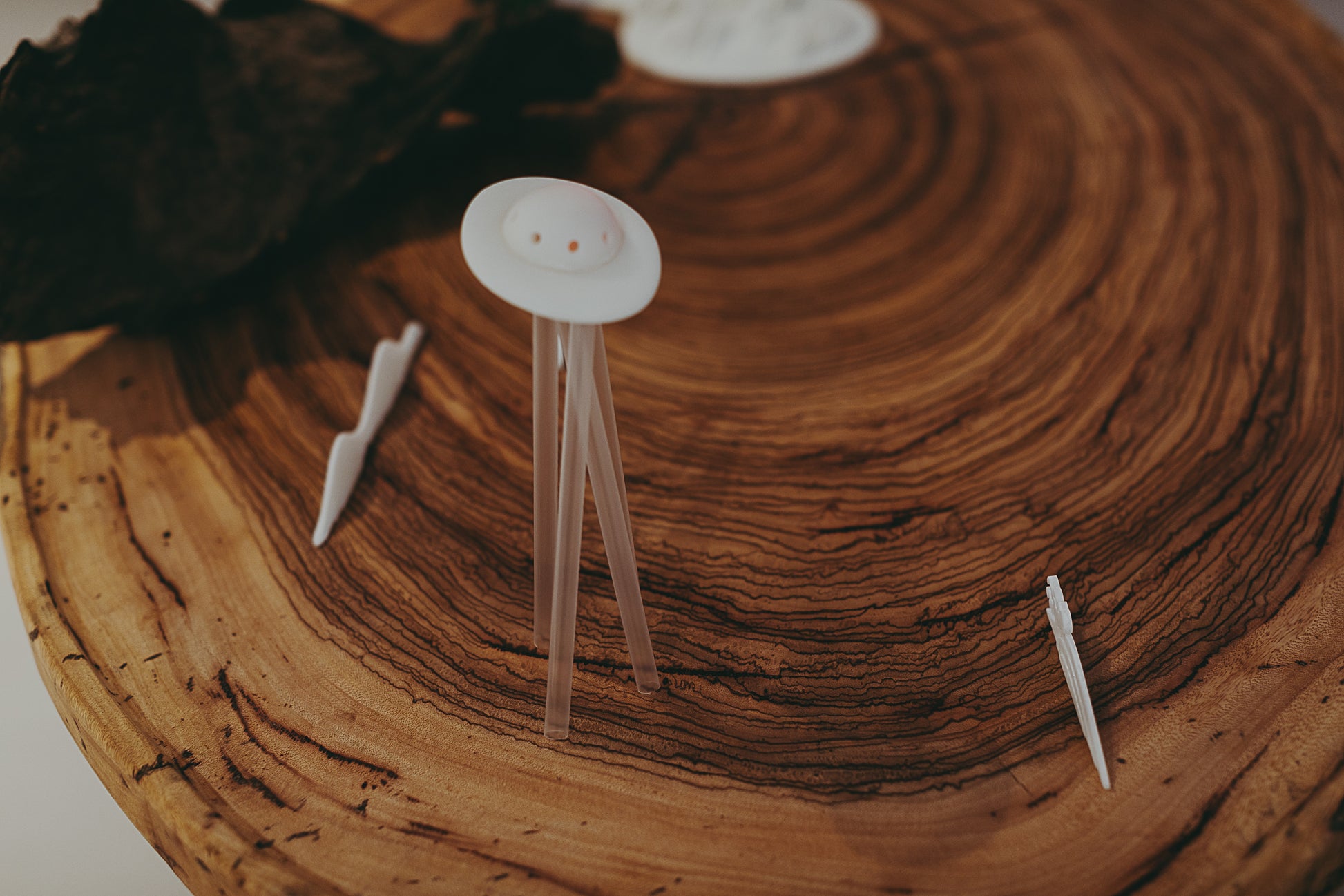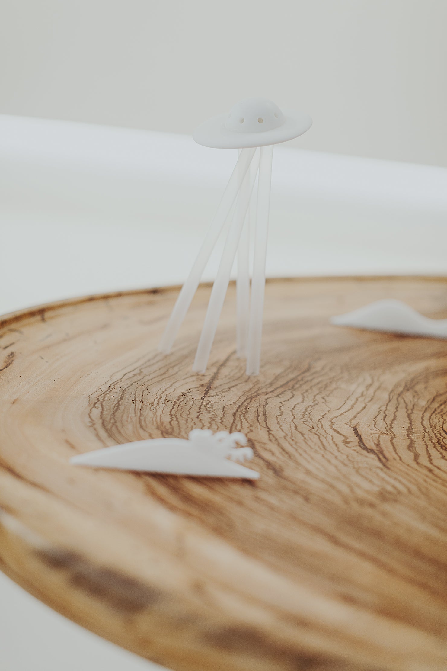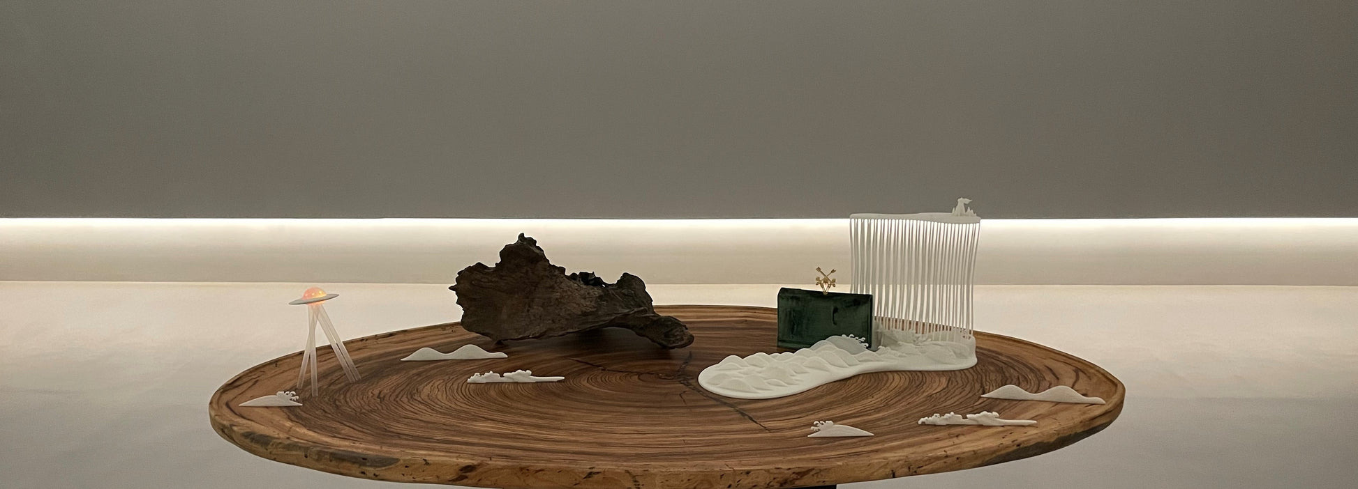 Collaboration with artist and handbag designer, Kris Xu. UV curable resin, inspired by the painting, "Red Cliff", from the Song Dynasty. On Forest Table, by Xiao Jie Zhu.